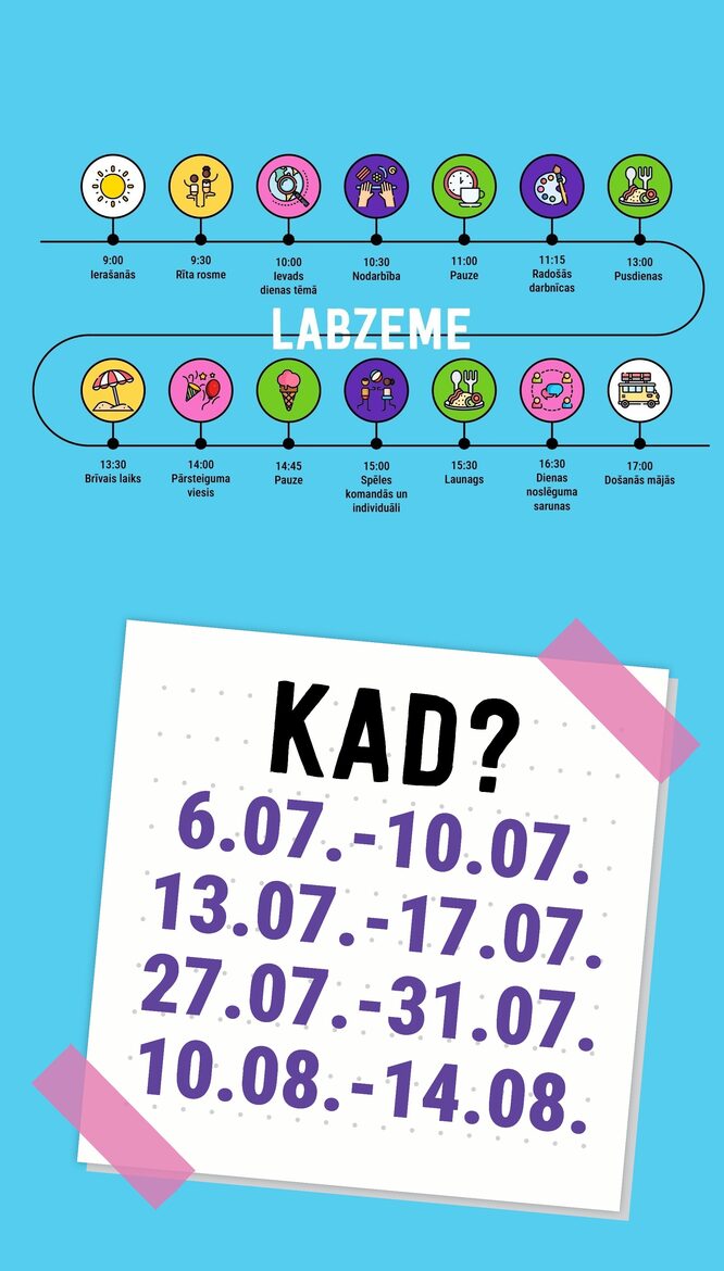 Dienas radošā piedzīvojumu nometne LABZEME fokusējas uz jaunu pieredžu veidošanu, attīstot bērnā pašpārliecinātību un prasmes, kas ietver - Veselības, Radošuma, Izziņas, Apzinātības un Piedzīvojuma garu.